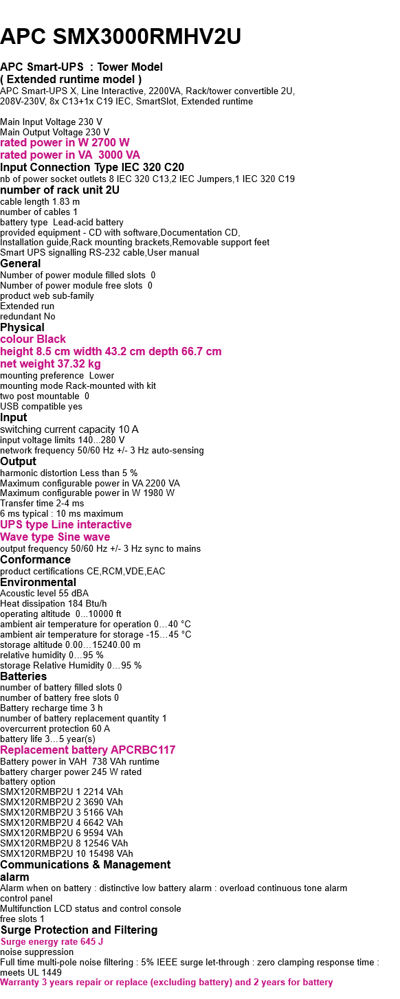 เครื่องสำรองไฟ apc smx3000rmhv2u เป็นเครื่องสำรองไฟ ที่เหมาะกับอุปกรณ์ computer, server และอุปกรณ์ทางการแพทย์ ตัวเครื่องเป็นได้ทั้ง แนวตั้งและแนวนอน ( tower/rack) ไฟเข้าออก 230V และกำลังไฟของเครื่องรุ่นนี้ 3000va 2700 watts เป็นแบบ line interactive ขนาดของเครื่อง 2U ปลั๊กด้านหลังเครื่องมี 8 ช่อง การรับประกัน 3 ปี onsite service ทั่วประเทศ